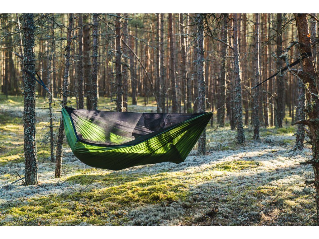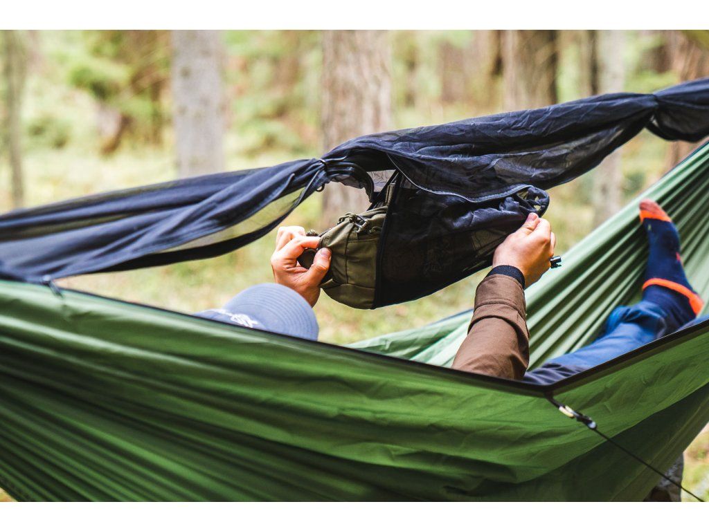 - elastické boční odtahy, které zvětšují vnitřní prostor hamaky, usnadňují přístup, manipulaci se spacákem i kontrolu věcí uvnitř