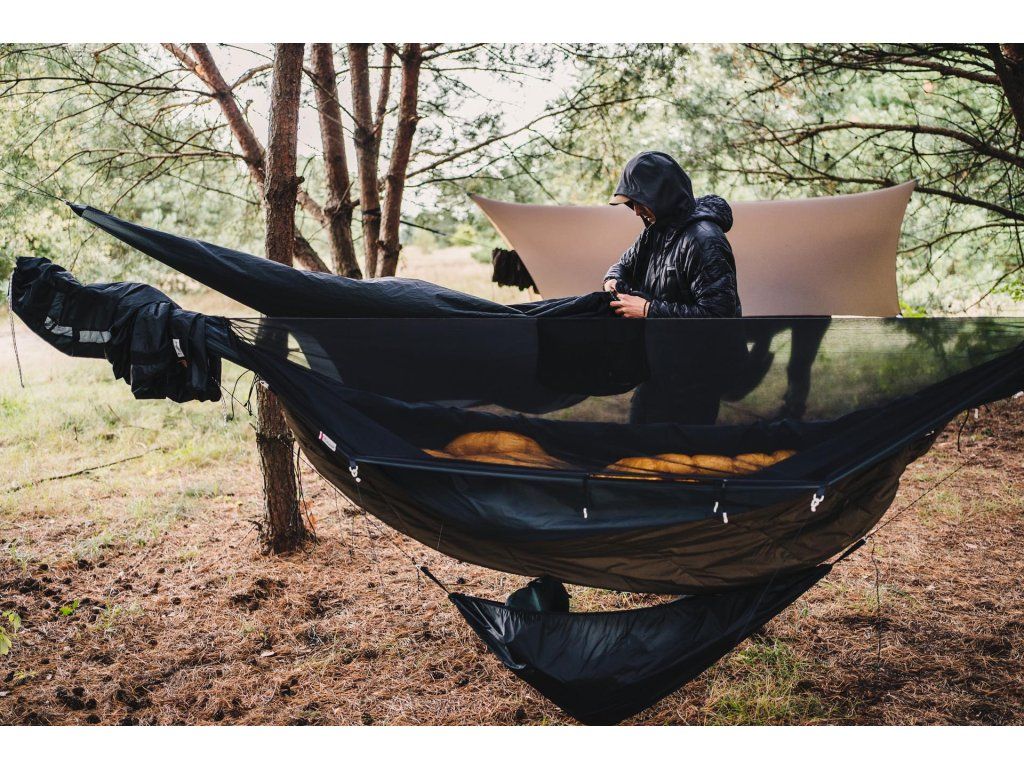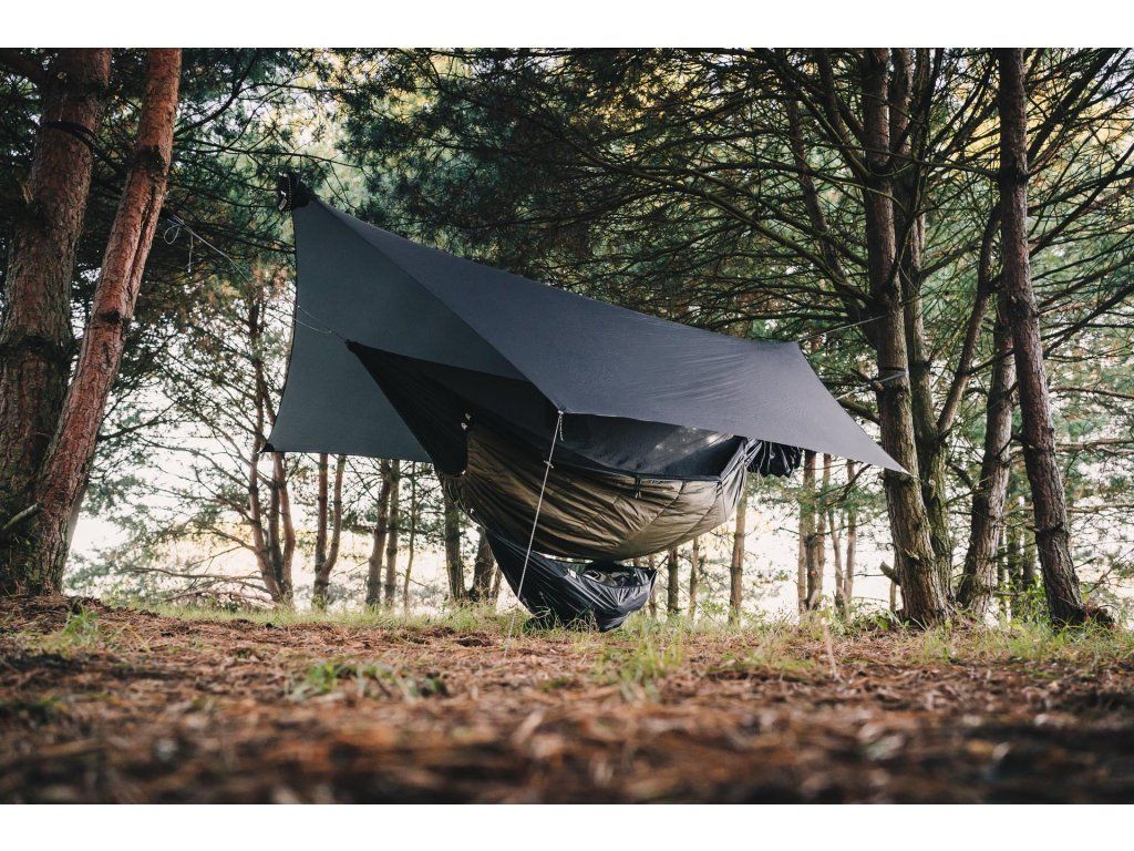 Instalace je neuvěřitelně jednoduchá a nezávislá na vaší hlavní hamace. Pomocí přiloženého systému ji zavěsíte pod svůj nocleh, kde HUBA slouží i jako dodatečná bariéra proti větru. Je vyrobena z lehkého a pevného Ripstop nylonu, který znáte z prémiových hamak Lesovik, takže je nejen odolná, ale i extrémně skladná.