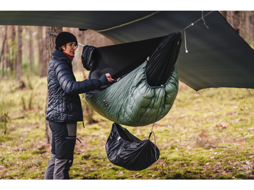 Doporučujeme: Pokud používáte OTUL Lite zateplení (underquilt), HUBA se instaluje pod něj. Pomáhá také fixovat spodní izolaci a zvyšuje tak váš tepelný komfort tím, že brání proudění vzduchu přímo pod hamakou.