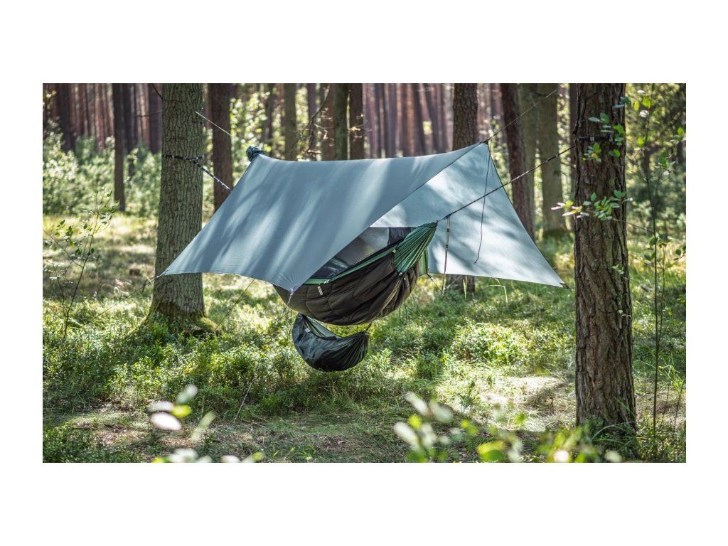 Hřbet tarpu o délce 360 cm je dostatečně dlouhý na to, aby bezpečně zakryl i ty nejdelší hamaky (včetně modelu DRAKA) a ponechal prostor pro suchou "předsíňku", kde si můžete v dešti uvařit kávu nebo přezout boty. Materiál tvoří prémiový Ripstop nylon s vodním sloupcem 6000 mm, což je hodnota, která vás udrží v suchu i během silné bouřky.